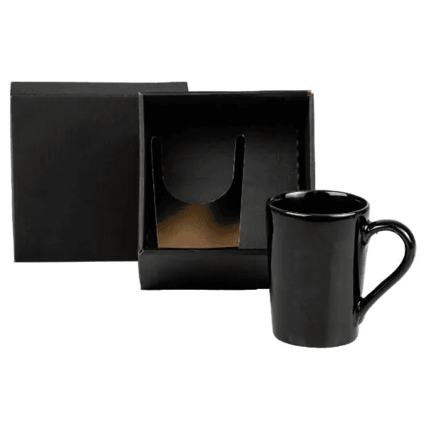 Caneca em cerâmica preta com capacidade para até 230 ml e uma embalagem com elástico para presente.