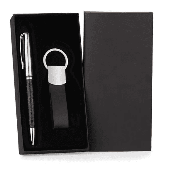 Conjunto de caneta e chaveiro em metal e material sintético preto. A caneta tem acabamento cromado brilhante e corpo revestido em material sintético preto. Carga esferográfica azul acionada com um giro no corpo da caneta.