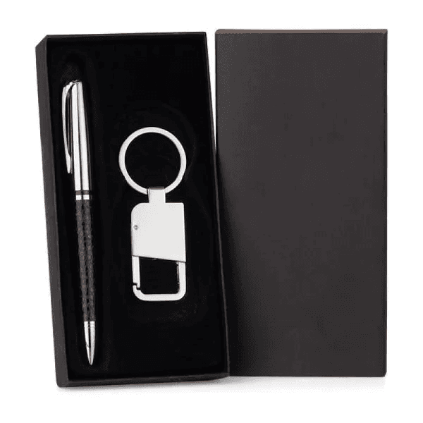 Conjunto com caneta e chaveiro. Conta com caneta em metal/material sintético com carga esferográfica azul e chaveiro em metal com mosquetão.