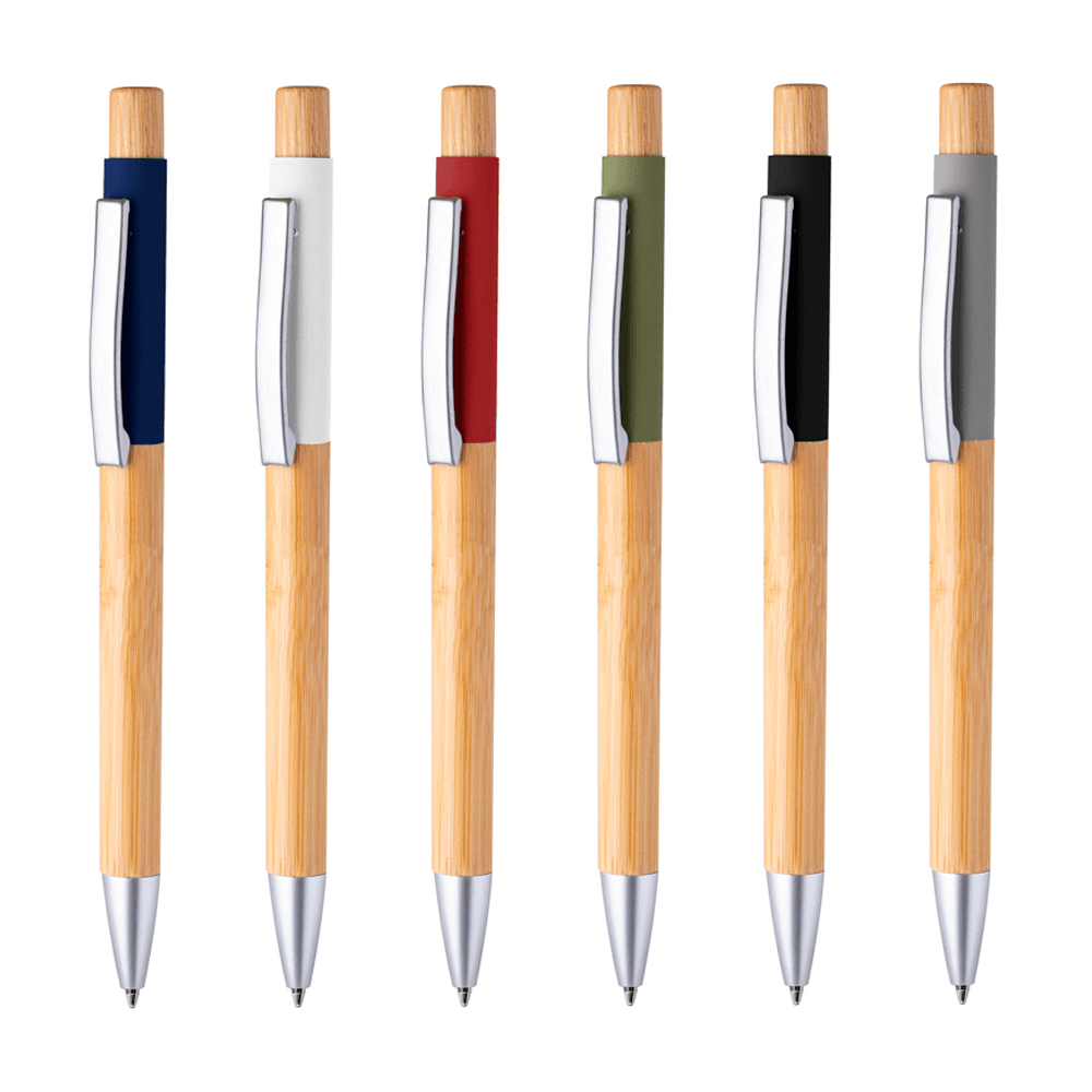 Caneta esferográfica em alumínio reciclável com escrita em azul. Refil parker e acionador e corpo em bambu.