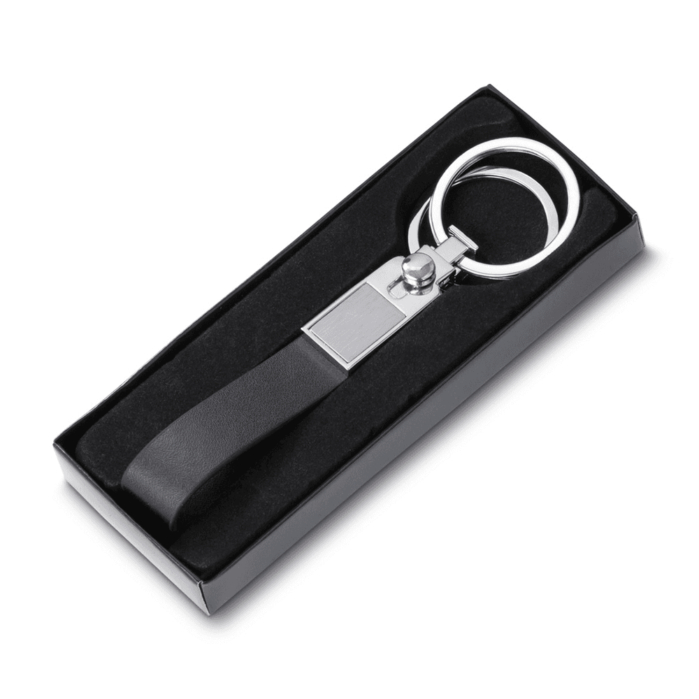 Chaveiro de metal com couro sintético preto com 2 argolas + caixa com berço aveludado. Engate rápido para uma argola. Área disponível para gravação em aço escovado.