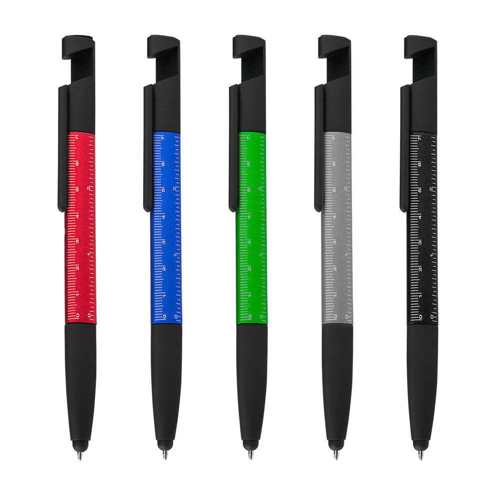 Caneta esferográfica metálica com escrita azul, ponta touch e funções integradas: chave de Fenda e Phillips, Suporte para smartphone, limpador de tela no acionador e régua no corpo da caneta.
