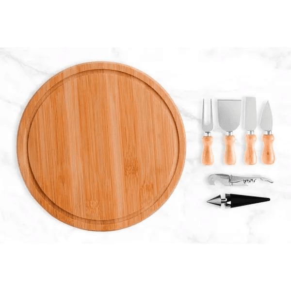 Composto por tábua para frios em Bambu; taça de vidro para champagne e conjunto de duas peças para Queijo em Madeira/Inox.
