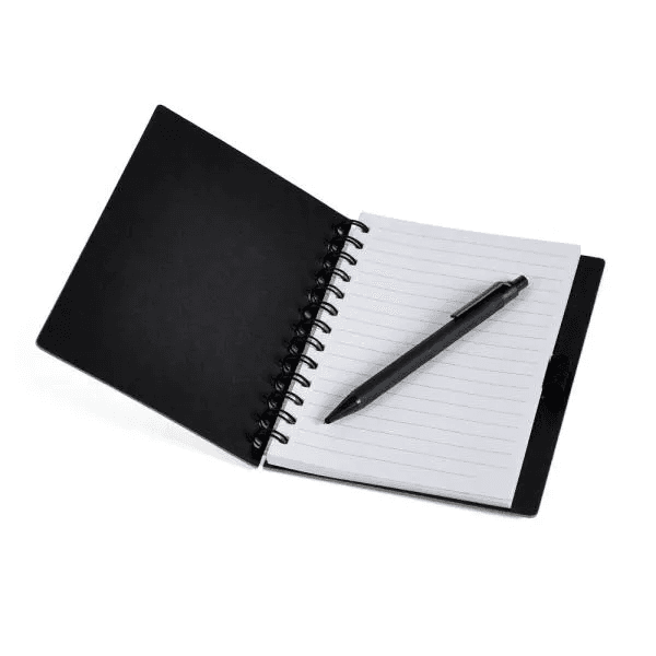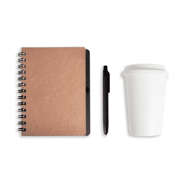Esse kit conta com caderno com 100 folhas brancas pautadas, espiral wire-o, caneta e copo em Fibra de Bambu / PP.