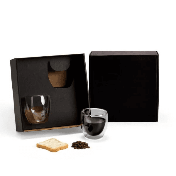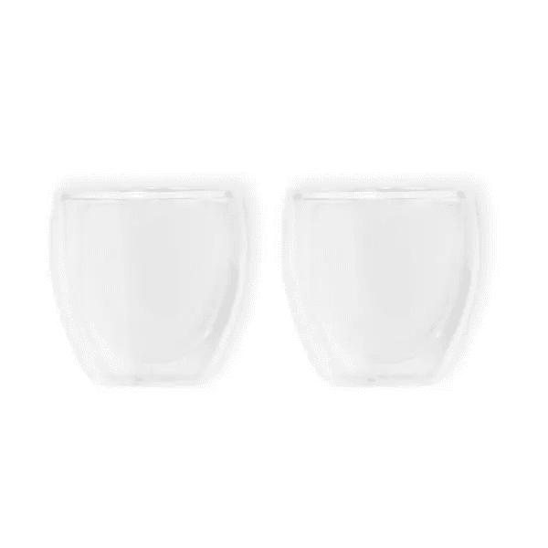 Dois copos em vidro parede dupla com capacidade de 250 ml. Mantém a temperatura da bebida por mais tempo.