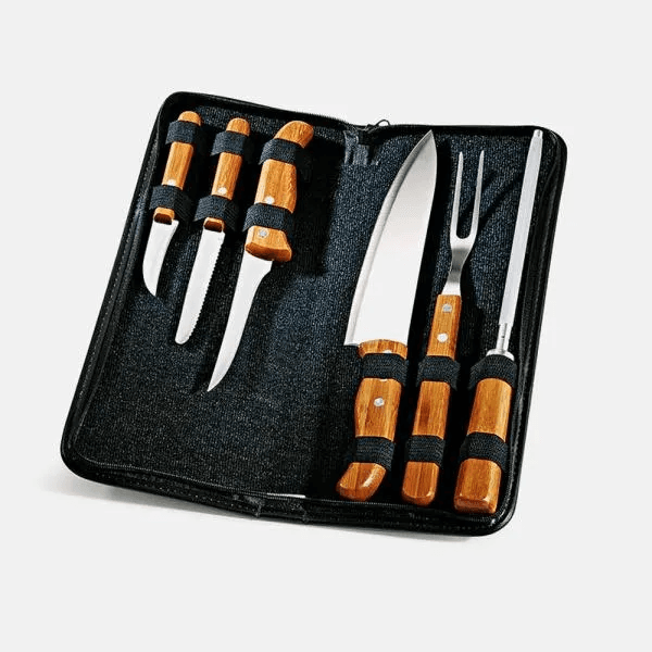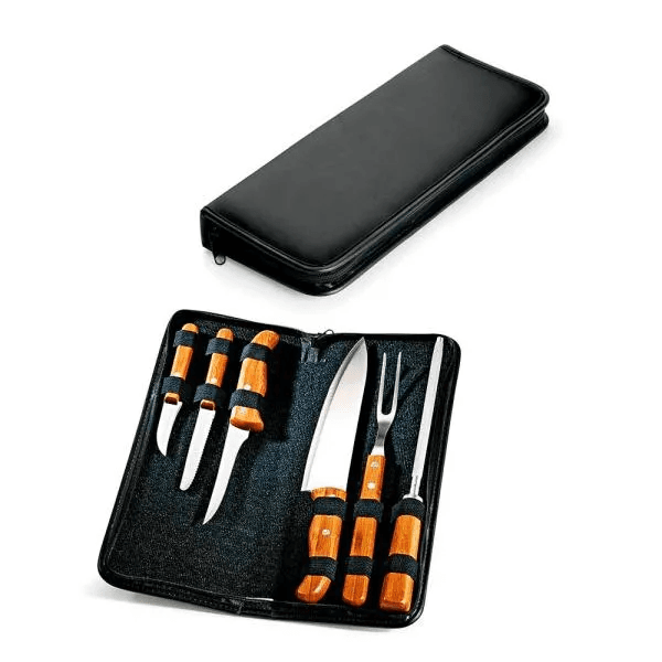Conjunto composto por faca 8", faca 4” para frutas, faca 5” para desossar e garfo trinchante em Madeira/Inox; faca 3” de legumes e chaira 8” em Bambu/Inox. Estão organizados em um estojo com toque almofadado.