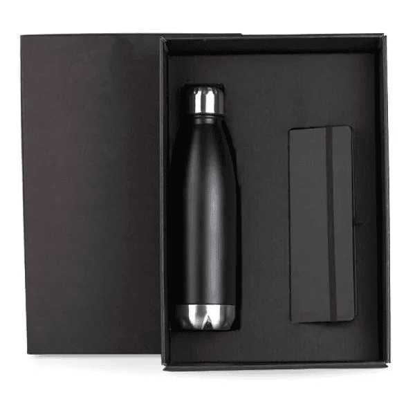 Conta com caderno para anotações preto com capa dura e garrafa em aço inox preta com tampa rosqueável e capacidade de 750ml.