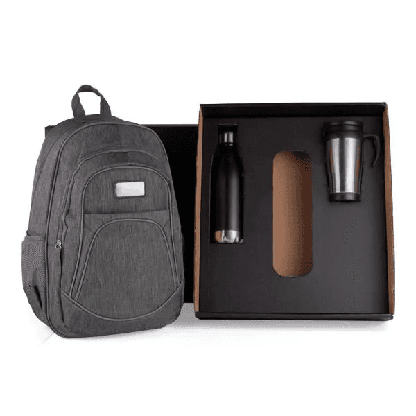 Kit conta com mochila cinza em poliéster 300D Melange cinza; garrafa em aço Inox preta com tampa rosqueável e caneca em polipropileno preto revestida em aço inox escovado.