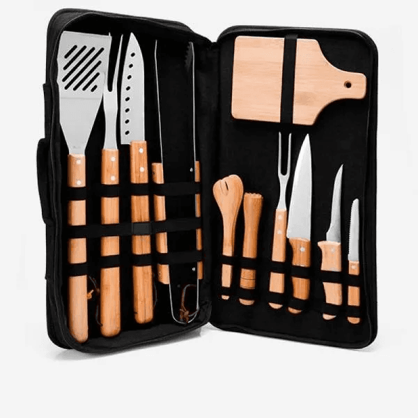 Kit para Churrasco e Caipirinha. Composto por estojo em tecido preto com alça de mão e avental; tábua para Churrasco, tábua para Caipirinha, pegador e socador em Bambu; faca 7'', faca para churrasco, pegador para Churrasco, espátula para Churrasco e garfo para Churrasco em Bambu/Inox. Acompanha também faca 4" para frutas, faca 5" para desossar e garfo trinchante em Madeira/Inox.
