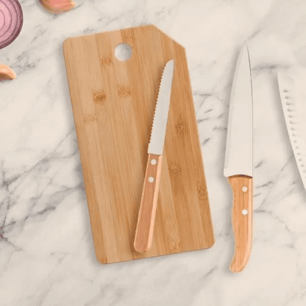 Kit para Cozinha em Bambu/Inox. Composto por tábua em Bambu com furo; faca 7'', faca Santoku em Bambu/Inox. Composto também por faca 4" para frutas em Madeira/Inox. Como cortesia, na faca 7" fazemos uma gravação com os cortes do boi.