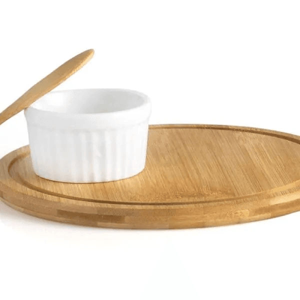 Conjunto para petiscos em bambu. Acompanha tábua e espátula em bambu, conta também com ramekin em porcelana.