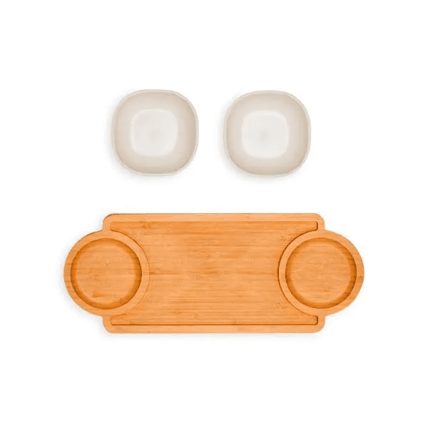 Conjunto para petiscos em Bambu/Fibra de bambu. Acompanha dois potes em fibra de Bambu e base em Bambu.
