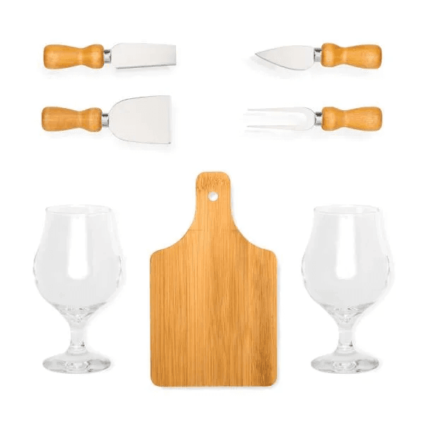 Conta com tábua em bambu; Duas facas, uma espátula e um garfo para queijo em madeira/inox; 2 taças para cerveja em vidro.
