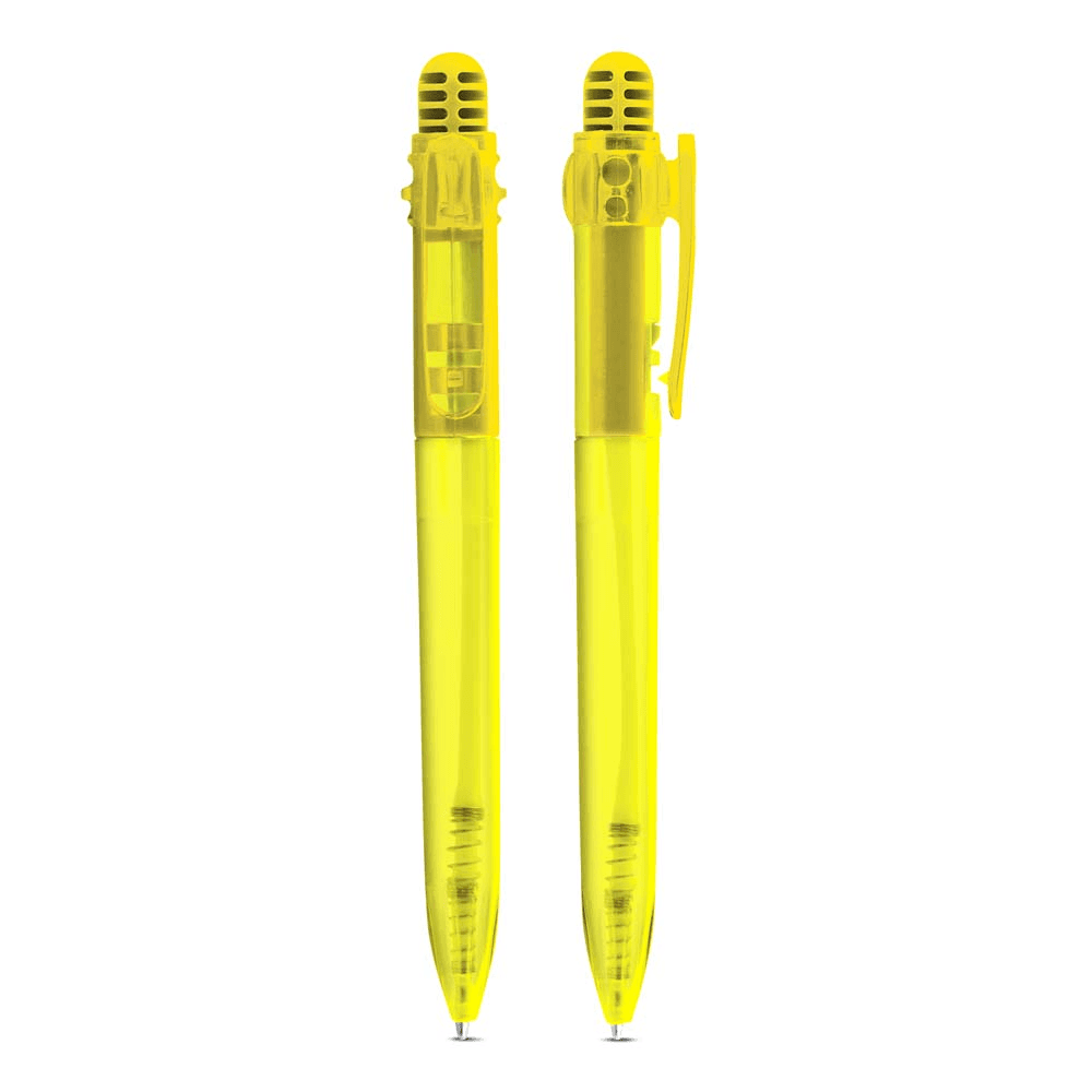 Caneta plástica translúcida esferográficaretrátil com grip, escrita azul e disponível em diversas cores. Confortável, funcional e ideal para ações promocionais.