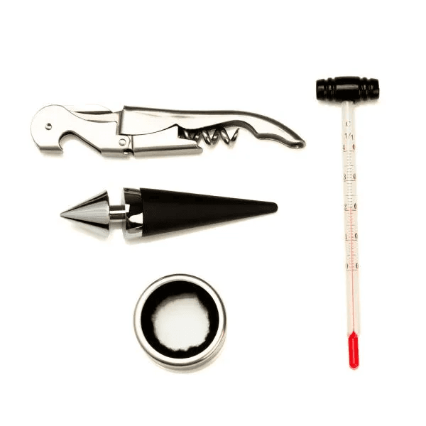 Acessórios para vinho em Metal com estojo em Bambu. Conta com espaço para a garrafa, tampão, termômetro, anel corta-gotas e abridor saca-rolhas. (NÃO ACOMPANHA GARRAFA)