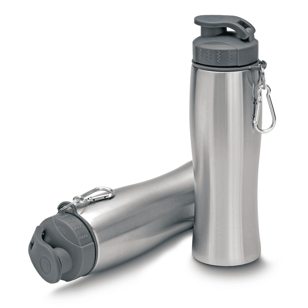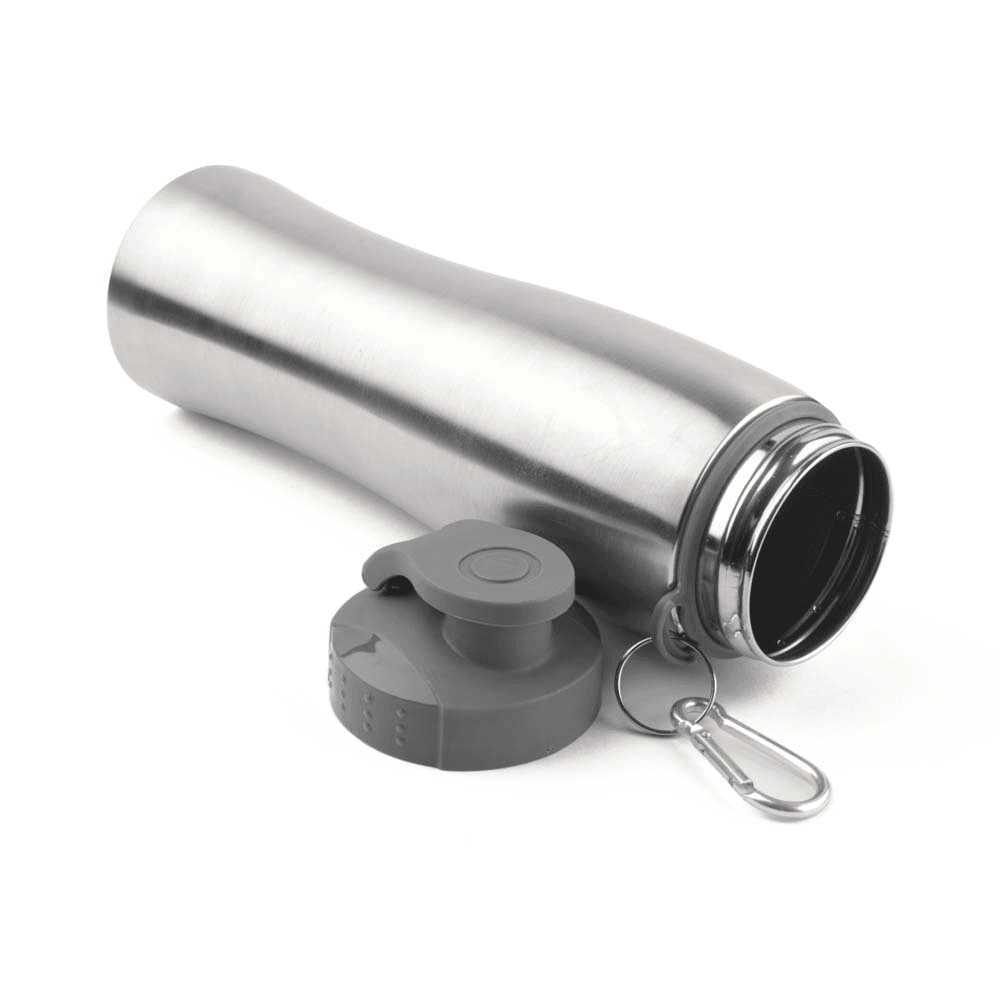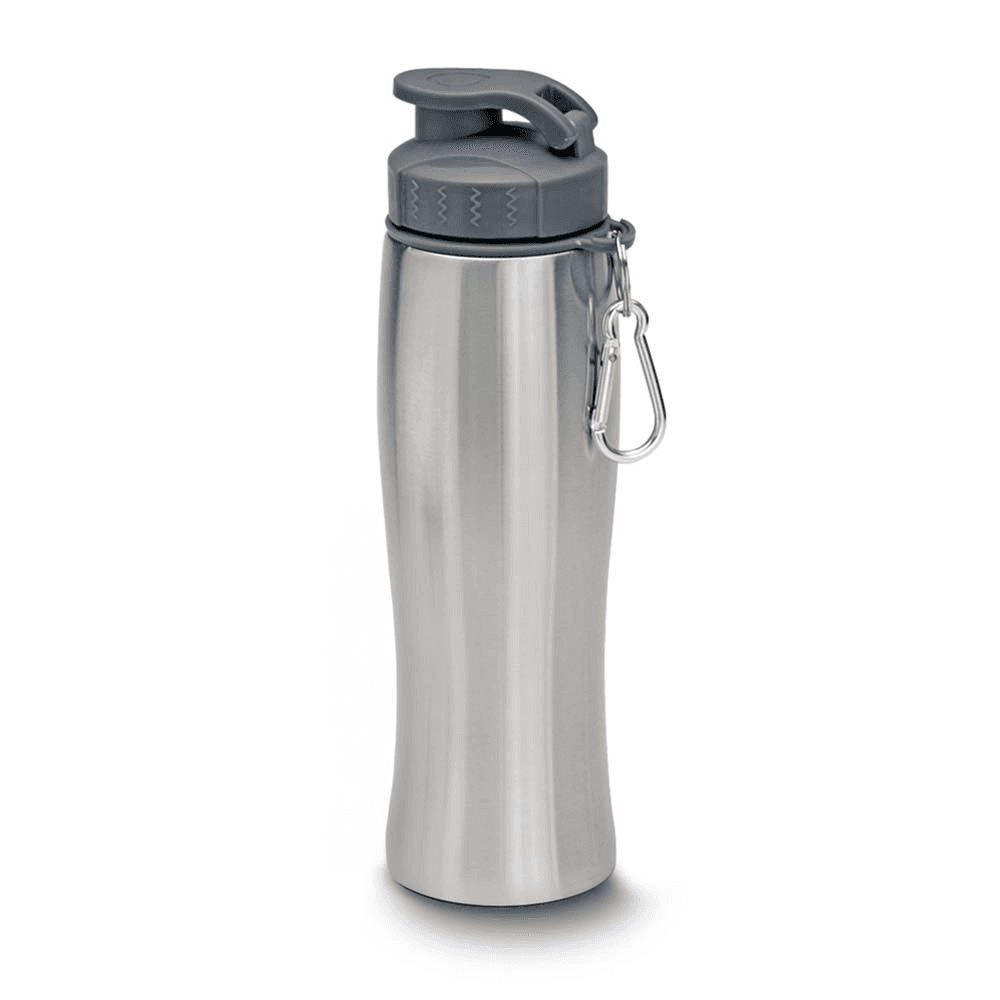 Garrafa de aço inox com capacidade de até 750 ml. Tampa rosqueável com anel de silicone. Bico com tampa para melhor segurança. Possui alça em formato de mosquetão.