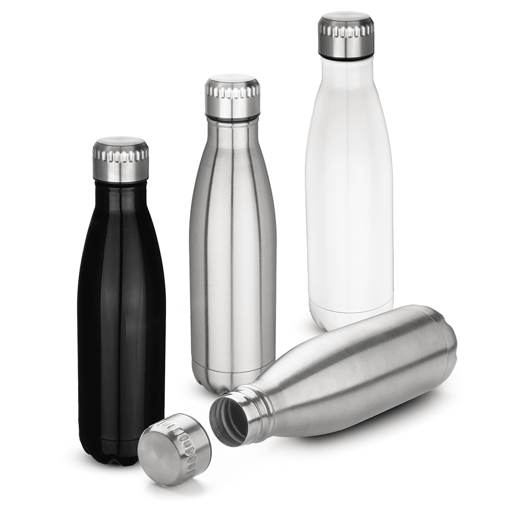 Garrafa em aço inox 304 com capacidade de até 700 ml. Tampa rosqueável e anel de silicone para vedação. Design com frisos na tampa.