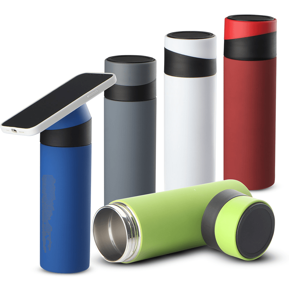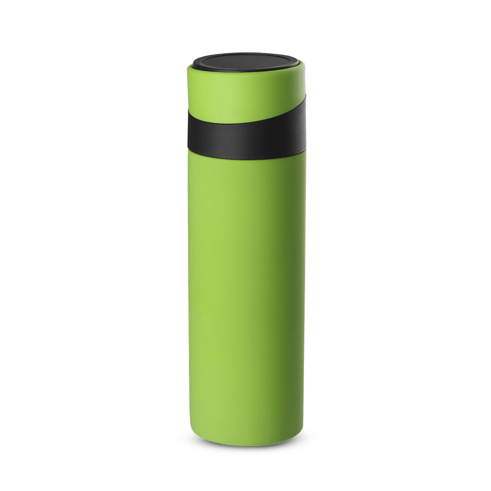 Garrafa térmica em aço inox com parede dupla isolada a vácuo, com capacidade de até 400 ml. Tampa rosqueável com anel de silicone para vedação. Com apoio de silicone para o celular na tampa.