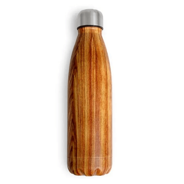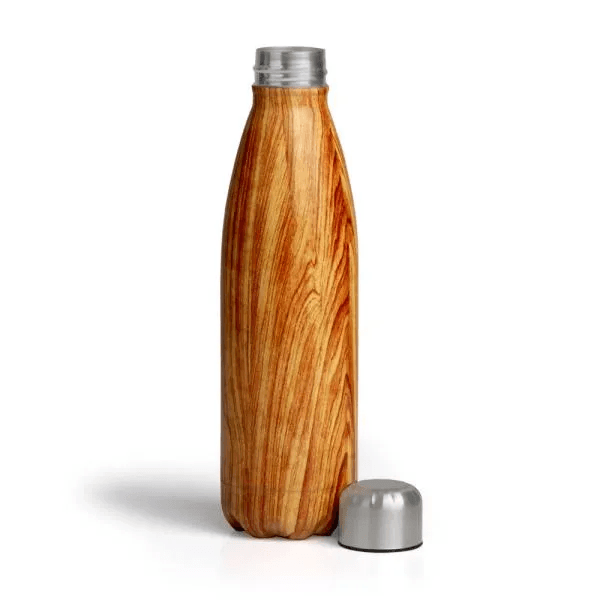 Garrafa em aço inox com pintura amadeirada. Conta com tampa rosqueável e capacidade total de 750ml.