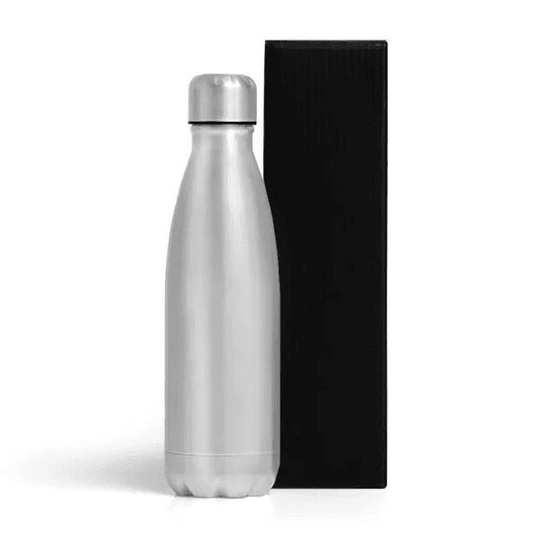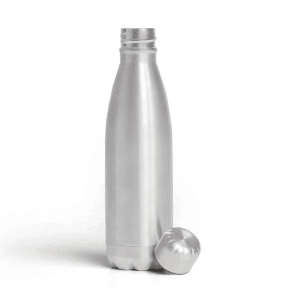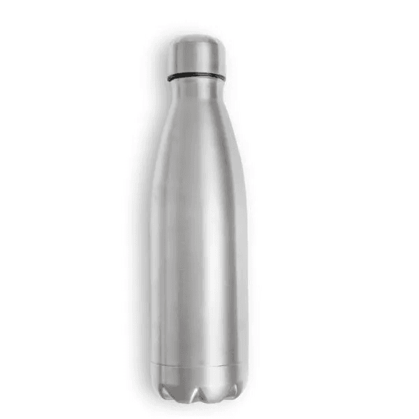 Garrafa em Aço Inox prata com tampa rosqueável e capacidade total de 750ml.
