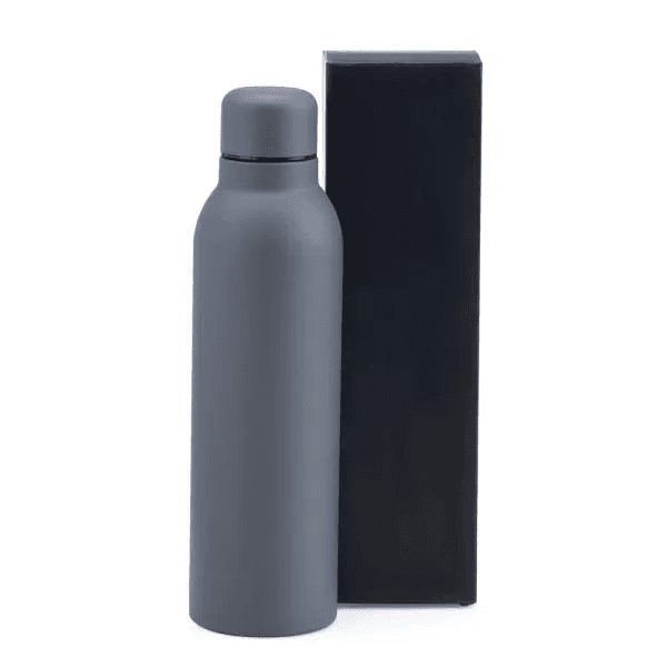 Garrafa cinza em metal Inox, confeccionada com dupla parede em Inox, assim conseguindo manter e preservar os líquidos gelados e quentes por mais tempo.