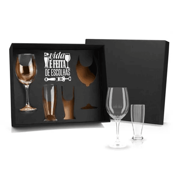Jogo de copos para vinho e cerveja. Conta com dois copos para cerveja e duas taças para vinho em vidro.