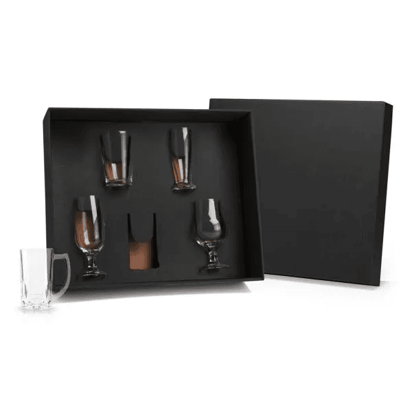 Jogo de copos para cerveja em vidro. Conta com 1 caneca de vidro para chopp/cerveja, 2 taças para cerveja/drink e 2 copos para cerveja/drinks.