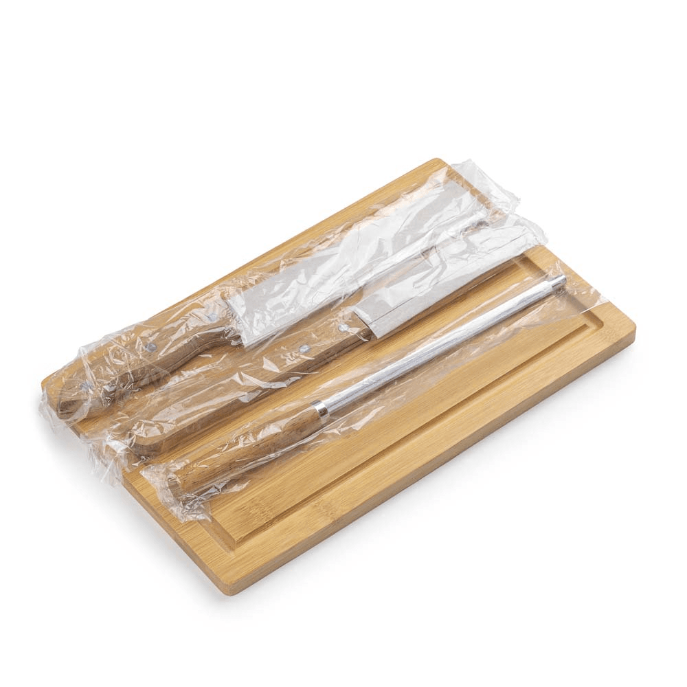 Kit churrasco com 4 peças: Garfo grande, Faca com 31,7 cm e uma Chaira, todos com cabos de madeira, ambos com cabos de madeira e lâminas em aço inox, e uma Tábua de bambu com 1,2 de espessura.