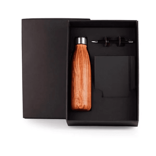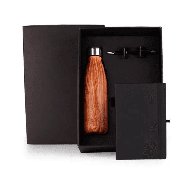 Kit de boas vindas. Composto por garrafa em aço Inox com pintura amadeirada; caderno para anotações preto com capa dura e caneta esferográfica em alumínio preta.