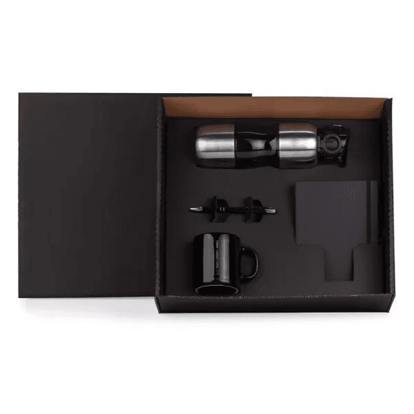 Kit boas vindas. Conta com garrafa 750ml revestida em aço inox; caneca em cerâmica 270ml; caderneta sem pauta; caneta esferográfica em alumínio com ponta touch.