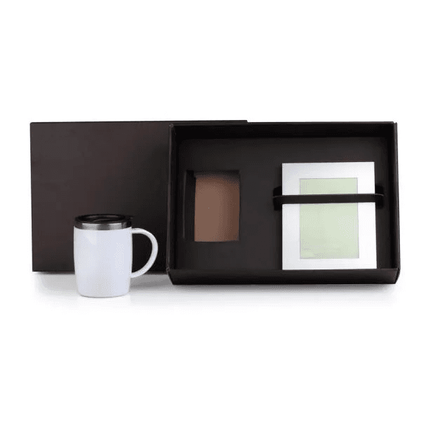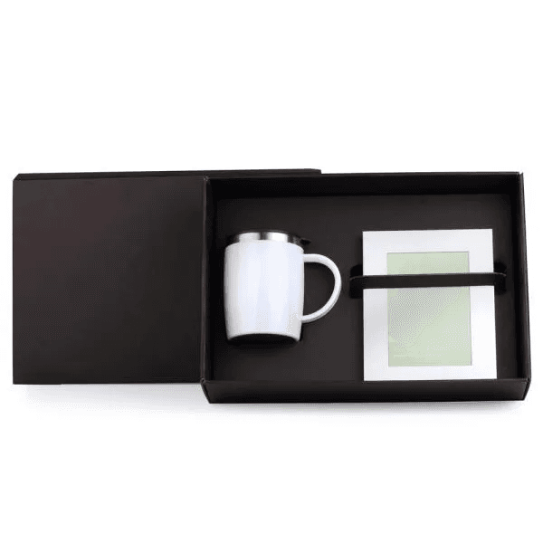Caneca em aço inox com revestimento de Poliestireno branco e tampa em Polipropileno e porta-retrato em alumínio fosco.