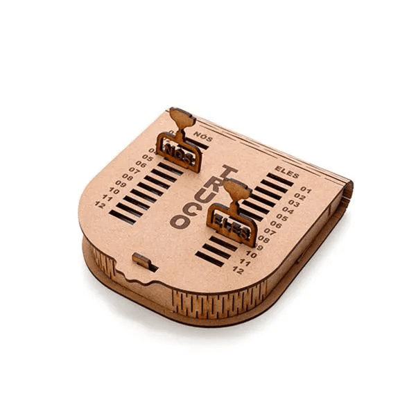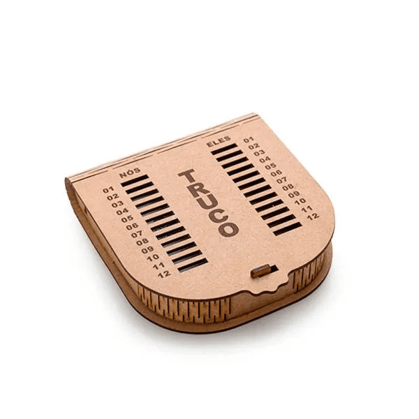 Kit para Churrasco, Cerveja e Truco. Composto por tábua com três furos em Bambu; garfo trinchante e faca 8" em Madeira/Inox; seis copos de Cerveja em vidro; caixa para truco com jogo de cartas, marcador de tentos e jogos em MDF.
