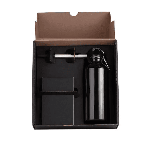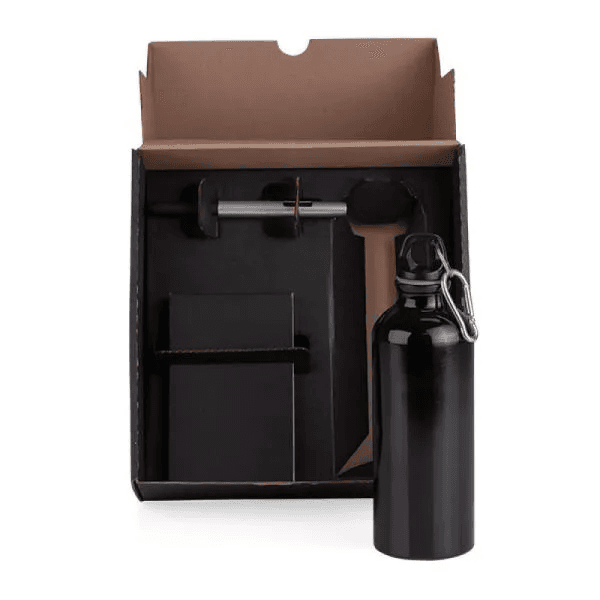 Kit squeeze, caneta e bloco. Composto por garrafa em alumínio de 500ml revestido com verniz; bloco para anotações preto e caneta esferográfica em ABS prata.