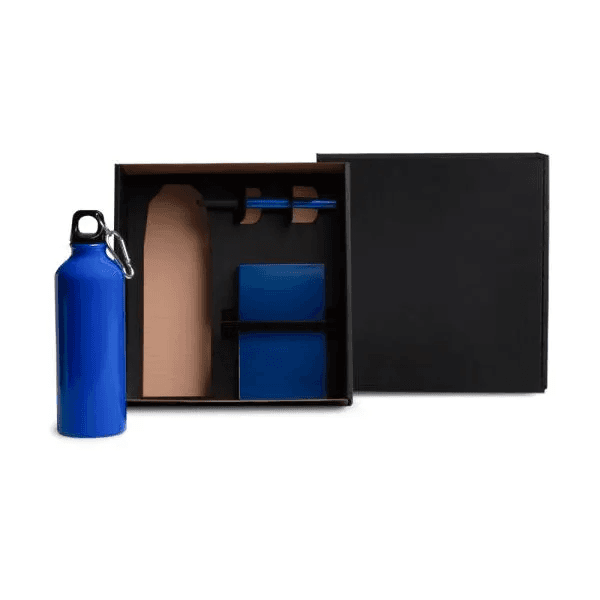 Composto por garrafa em alumínio azul com capacidade de 500 ml; caneta esferográfica em ABS azul e bloco para anotações azul.
