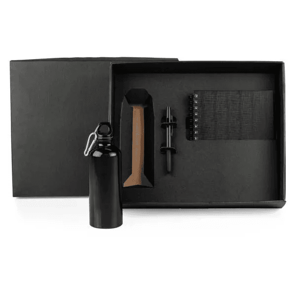 Kit composto por squeeze preto em alumínio revestido com verniz; caderno para anotações wire-o preto com capa dura revestida em percalux linho e caneta esferográfica em ABS preta.