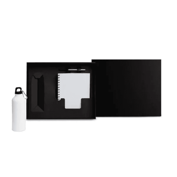 Composto por squeeze branco em alumínio revestido com verniz; caderno para anotações wire-o branco com capa dura e caneta esferográfica em ABS prata.