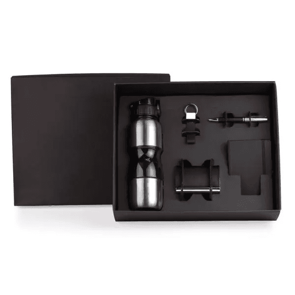 Kit escritório composto por squeeze fumê revestido em aço Inox 750ml; caderno para anotações preto com capa dura; caneta, porta-cartão e chaveiro em material sintético preto e metal cromado brilhante.