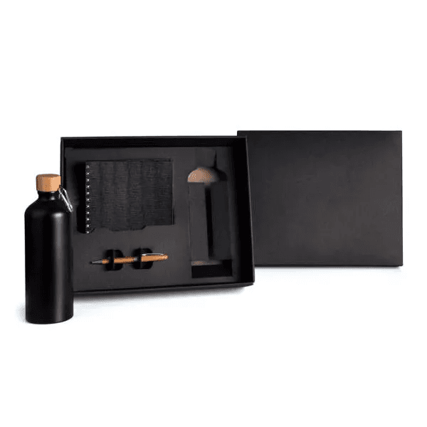 Conta com garrafa, caderno para anotações wire-o preto com capa dura e caneta confeccionada em bambu ecológico.