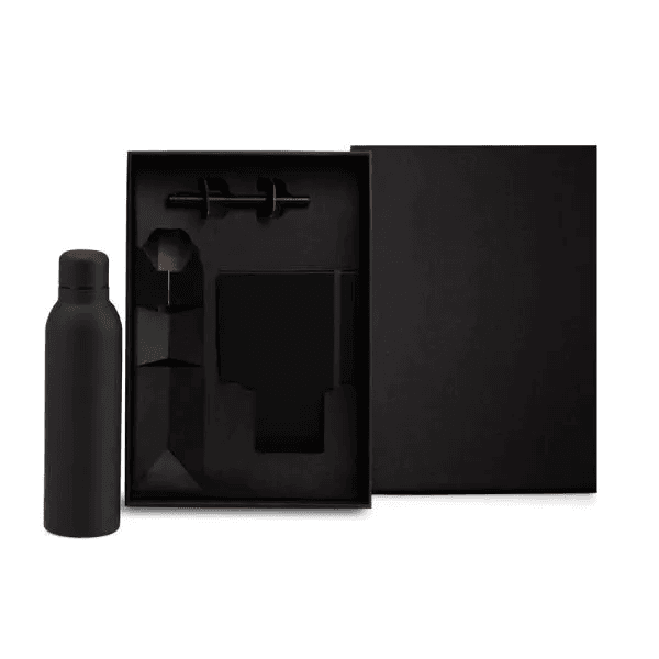 Composto por garrafa preta em metal Inox, confeccionada com dupla parede em Inox; caderno para anotações preto com capa dura e caneta roller em alumínio com tampa preta.