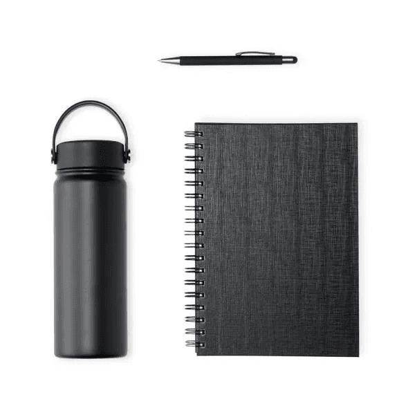 Composto por garrafa em Inox na cor preta, confeccionada com dupla camada; caderno para anotações wire-o preto com capa dura; caneta esferográfica em alumínio preto.