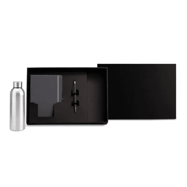 Composto por garrafa prata com dupla parede de Inox; caderno para anotações cinza com capa dura e caneta esferográfica em alumínio cinza.