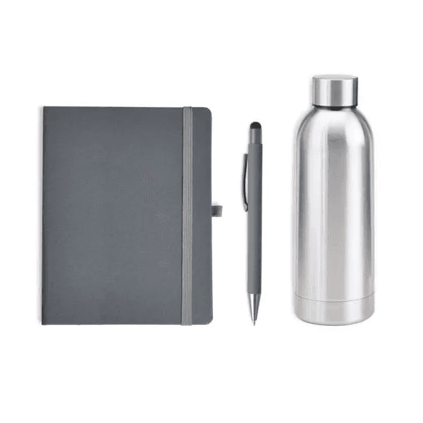Modelo: Kit Garrafa, Caderno E Caneta - Cinza/Prata - 3 Pçs KT-90359