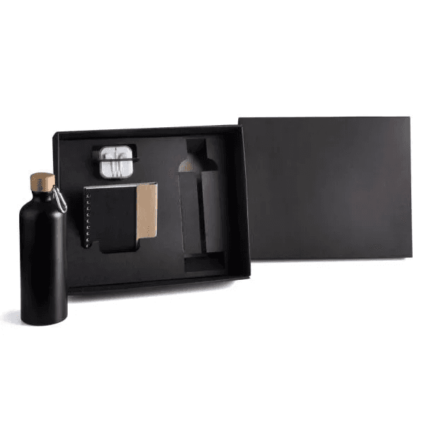 Conta com garrafa, caderno espiral preto/bege com capa, caneta em Papelão Reciclado rígido e fone de ouvido.