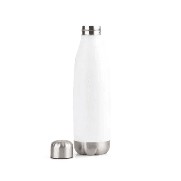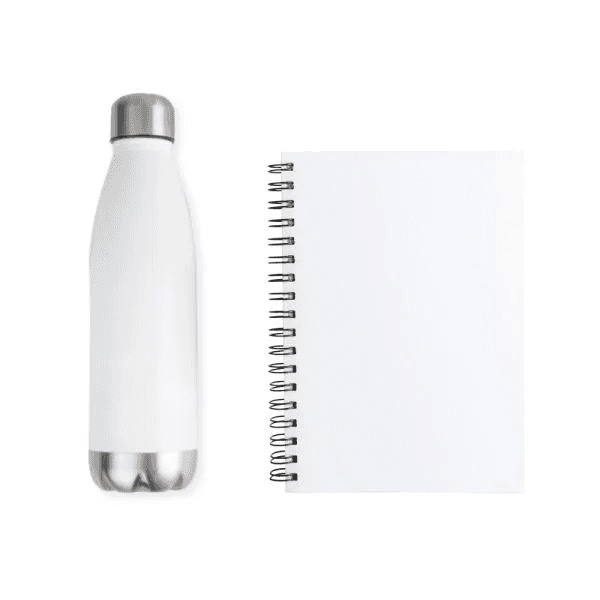 Esse kit conta com garrafa em aço inox branca com tampa rosqueável e capacidade total de 700ml, conta também com caderno para anotações wire-o branco com capa dura, folha para dados pessoais, calendário e 100 folhas pautadas.