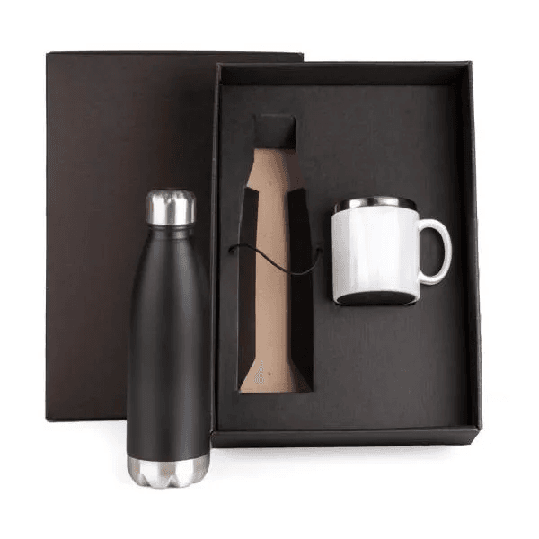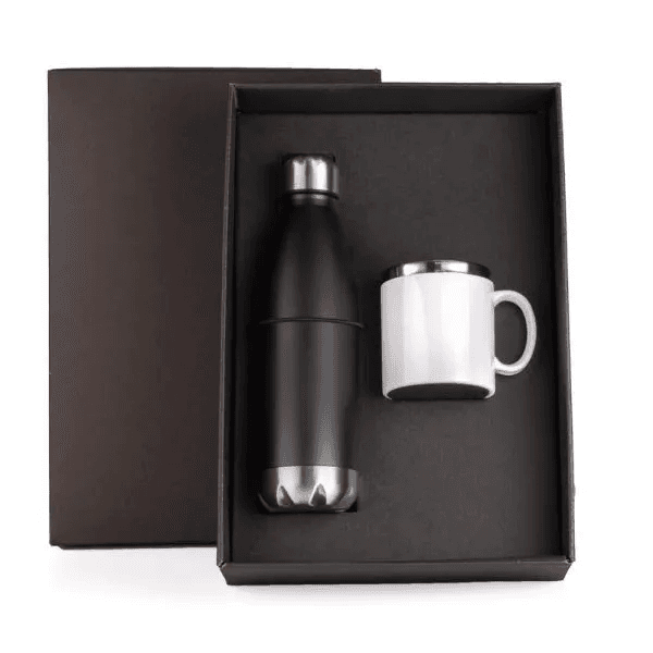 Kit garrafa e caneca. Composto por Garrafa em Aço Inox preta com tampa rosqueável e caneca confeccionada em aço inox escovado com acabamento externo em poliestireno branco.