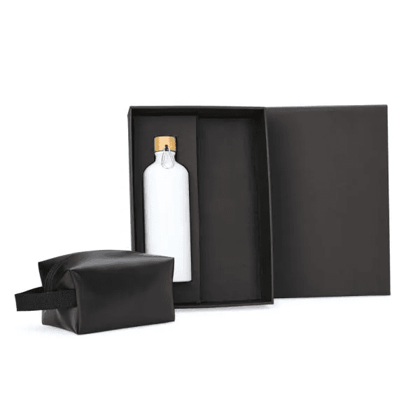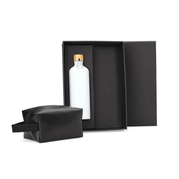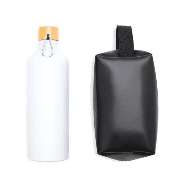 Kit garrafa e necessaire. Composto por garrafa em alumínio na cor branca com capacidade de 1 litro e necessaire com alça em material sintético na cor preta.