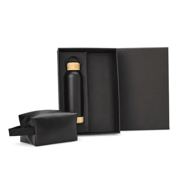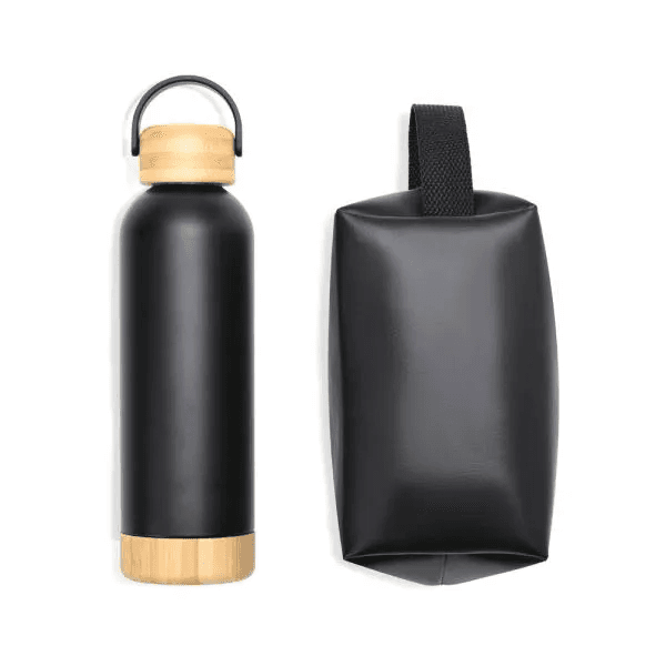 Kit garrafa e necessaire. Composto por garrafa dupla camada em Inox na cor preta, confeccionada com detalhes em Bambu na tampa e na base. Conta também com necessaire com alça em material sintético na cor preta.