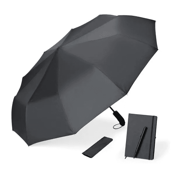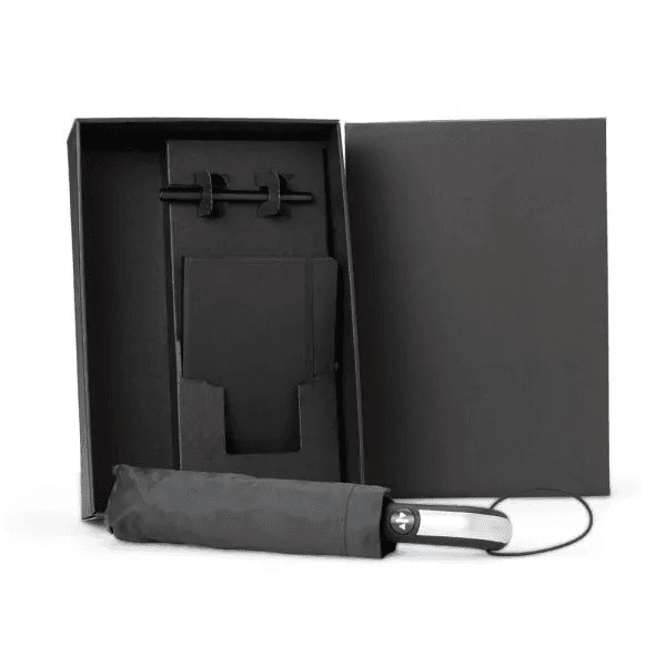 Kit guarda-chuva, caderno e caneta. Composto por guarda-chuva confeccionado em Nylon 190T na cor preta com ativação automática ao pressionar um botão, tanto para abrir quanto para fechar, empunhadura confortável com elástico para fixar no pulso, diminuindo o risco de queda e aumentando a segurança. Conta também com caderno para anotações preto com capa dura e caneta roller em alumínio com tampa preta.