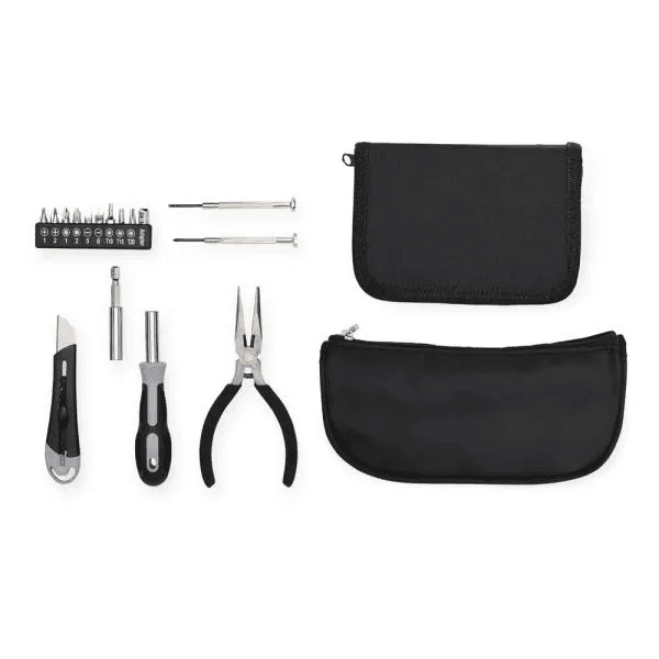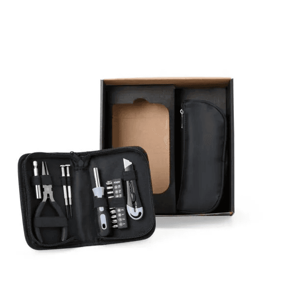 Composto por necessaire preta em Microfibra; alicate de bico; chave com dez peças de ponteiras + extensor, sendo quatro phillips, duas fendas, três torx e adaptador; duas chaves de precisão, sendo uma phillips e uma fenda; estilete; estojo em nylon com fechamento em zíper.