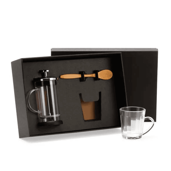 Composto por cafeteira prensa francesa em vidro; caneca americana em vidro com capacidade de 270 ml e colher de 18 cm em Bambu.